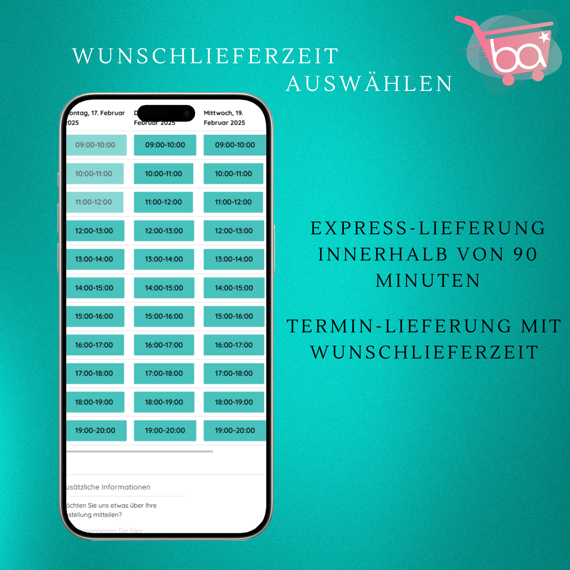- Terminlieferung: Lieferung im gewünschten 1-Stunden-Zeitfenster zwischen 09:00 und 20:00 Uhr